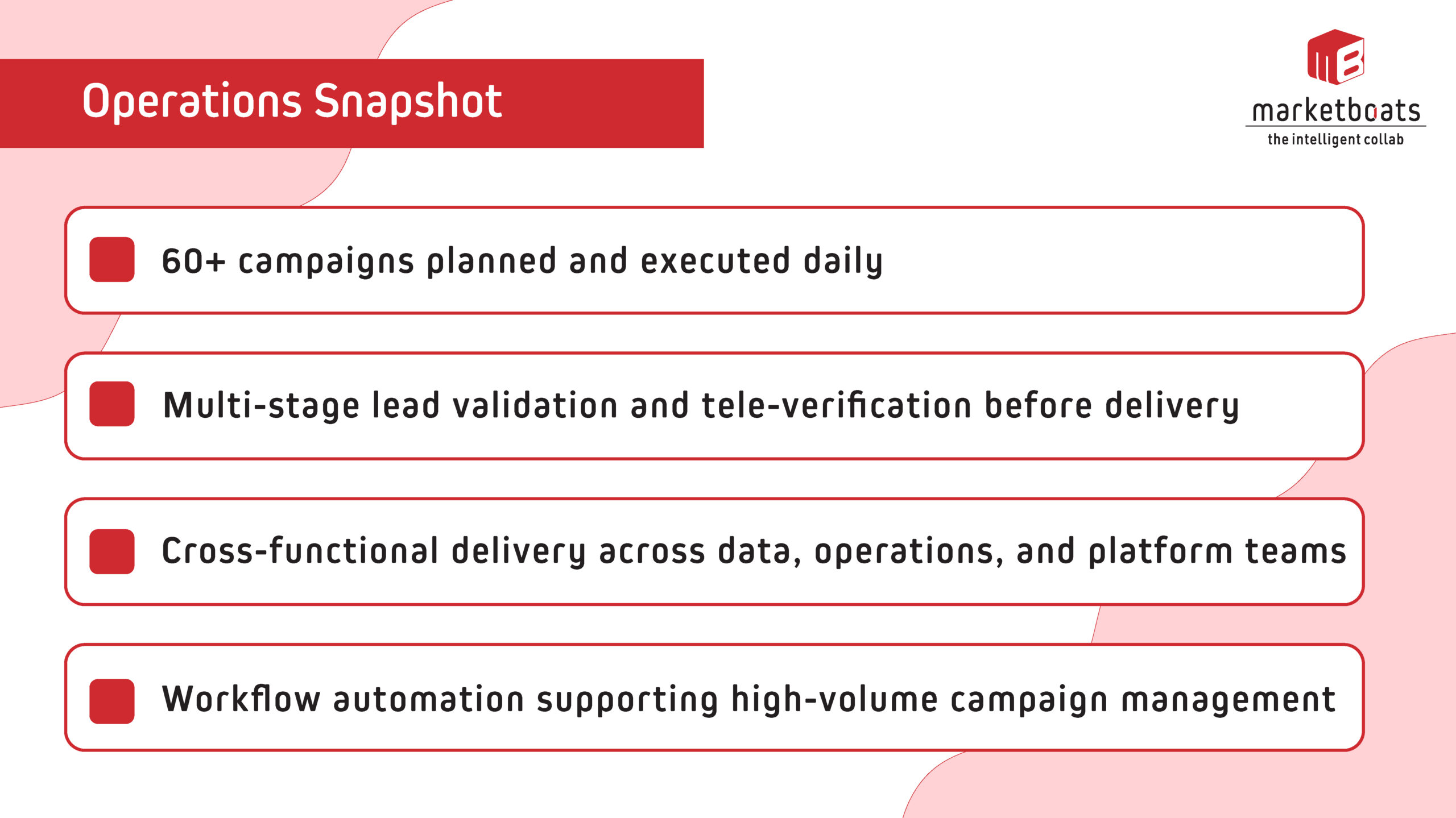 At Marketboats, we run B2B lead generation operations across outbound and demand generation programs. On an average day, we plan and execute more than 160 campaigns and deliver thousands of validated leads to clients across technology, healthcare and enterprise software sectors.